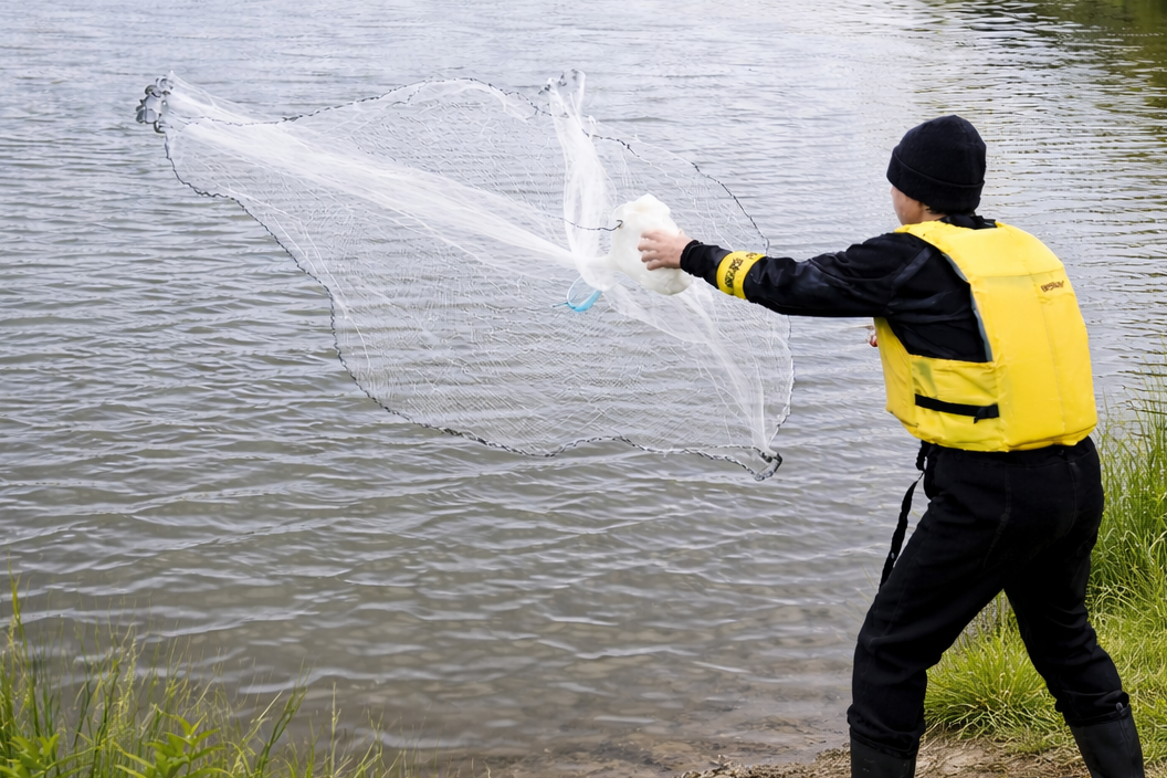 魚類調査は、タモ網や投網、潜水調査などの方法を使います。規模の大きな河川やダム湖などではゴムボートや小型漁船を使い、定置網や刺し網など大掛かりな調査が行われます。また、保全策が必要な魚種が確認された場合は、更にその魚種の生息場所や産卵場所などの詳細な調査が行われます。